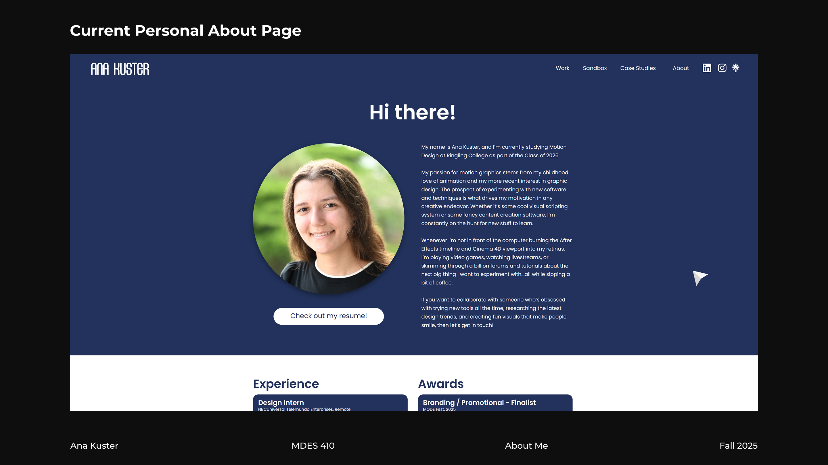 With how much I've recently delved into interactive motion experiences in my last couple of projects, I realized that my About page could benefit a ton from some fun interactivity that brought far more attention to my identity than a simple portrait photograph. I started this project with the goal of introducing a replacement for my About picture that was fun to look at and play with, and I additionally wanted it to demonstrate my current interactivity skills.